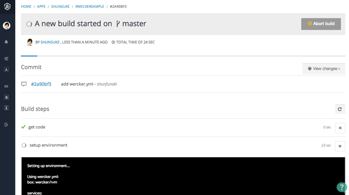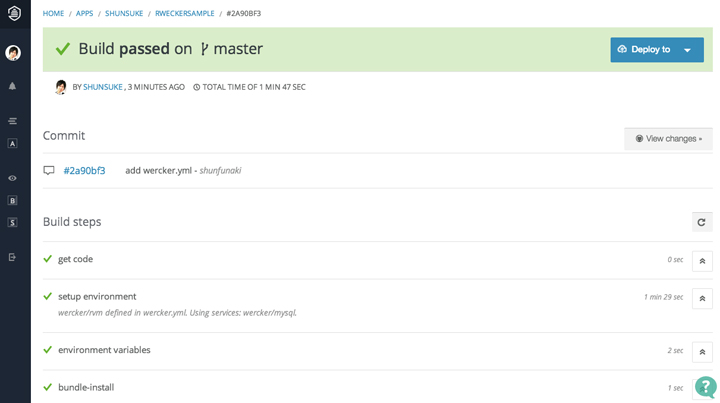 ビルド成功。先ほどwercker.ymlで設定したrspecも自動的に実行されてパスしています。